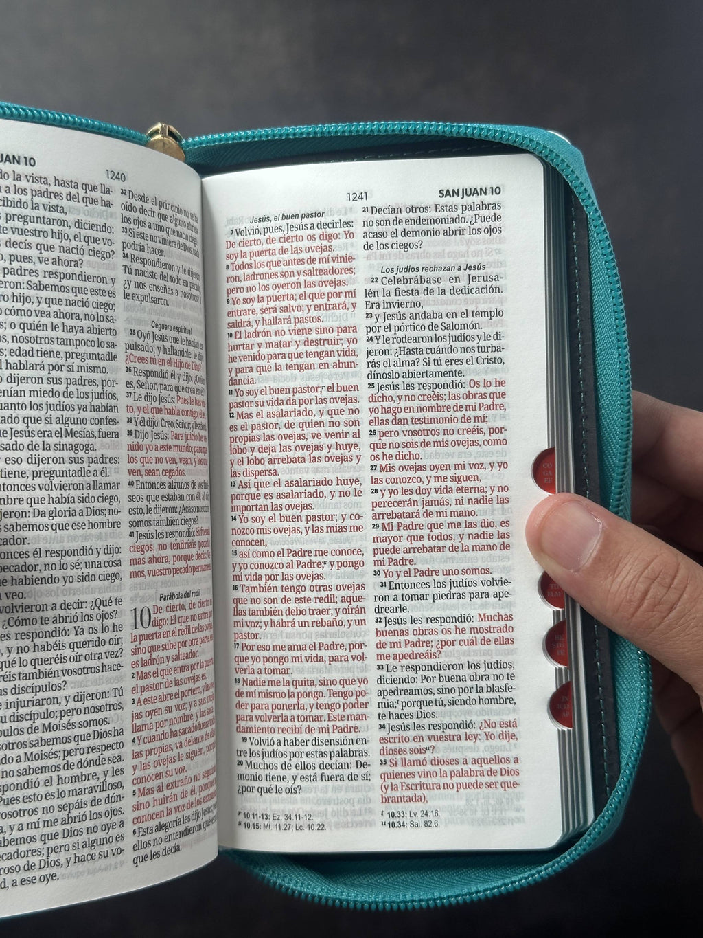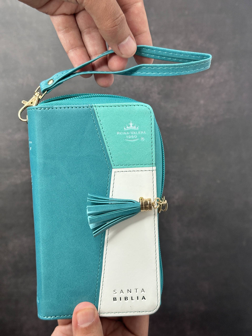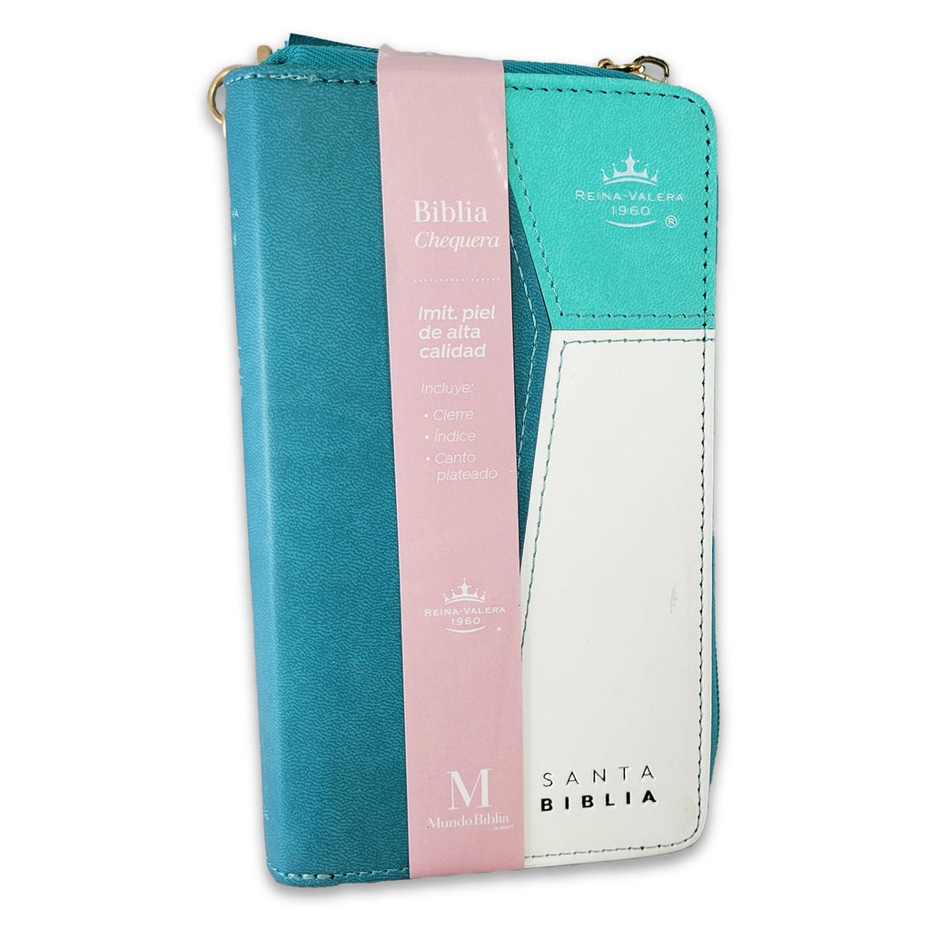 Biblia Chequera Reina Valera 1960 en imitación piel turquesa y blanco con índice. Tamaño compacto perfecto para llevar contigo a donde vayas. Incluye índice para facilitar la búsqueda de libros bíblicos.