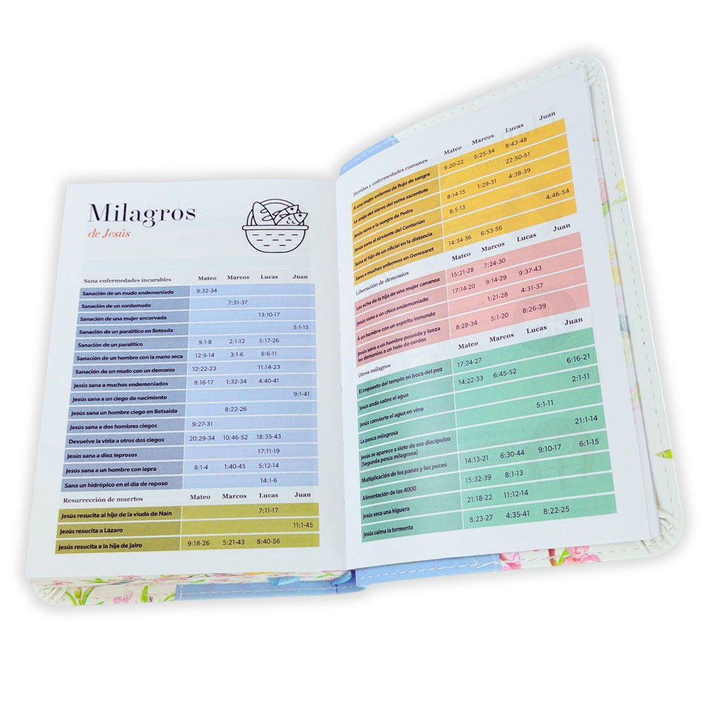 Reina Valera 1960 Tamaño 10x14cm 6x4.4 pulgadas inches Imitación piel 8, puntos Con canto pintado Palabras de Jesús en rojo Concordancia amplia de palabras de la Biblia Concordancia de personajes bíblicos 32 páginas a todo color con ayudas y esquemas que Versículos clave de cada libro Genealogía de Jesús Fiestas Biblicas Tipología de los salmos Plano del templo Cronología de Reyes y Profetas Cuadro con las parábolas de Jesús Cuadro con los milagros de Jesús Plan de salvación Promesas de Dios Plan de lectura en un año 12 mapas